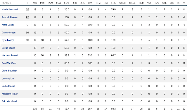 En el último partido los Raptors de Toronto ganaron en el segundo tiempo extra 118 - 112. Leonard anotó 36 puntos, incluyendo ocho en el segundo tiempo extra.